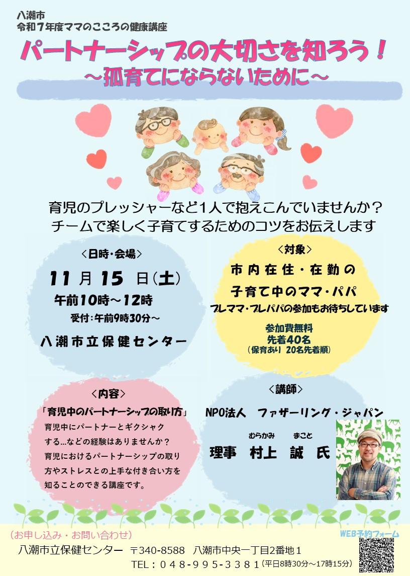 WEB【八潮市】講座申込フォーム(外部サイト)、保健センターへ電話・窓口にて受付