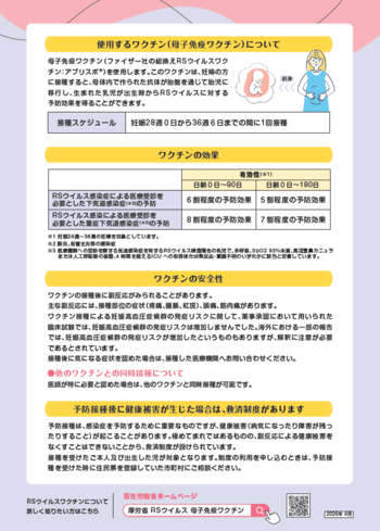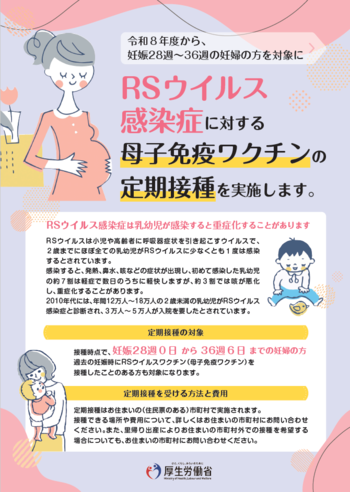 令和8年4月から、国の方針に基づき、RSウイルス感染症の定期予防接種(母子免疫ワクチン)が開始されます。接種を希望する方は、期待される効果や予想される副反応などについて、十分に理解した上で接種をご検討ください。