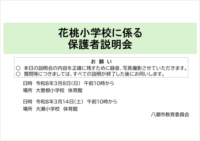 令和9年4月に開校を予定している花桃小学校につきまして、現在の状況等をご説明するため、下記のとおり保護者説明会を開催します。