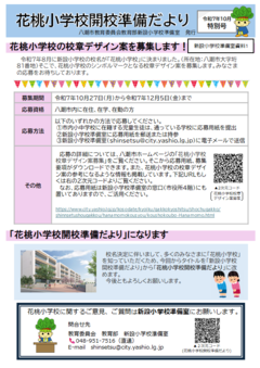 令和7年8月に校名が「八潮市立花桃小学校」に決まったことから、令和7年10月特別号から「花桃小学校開校準備だより」にタイトルを変更しました。ぜひご覧ください。