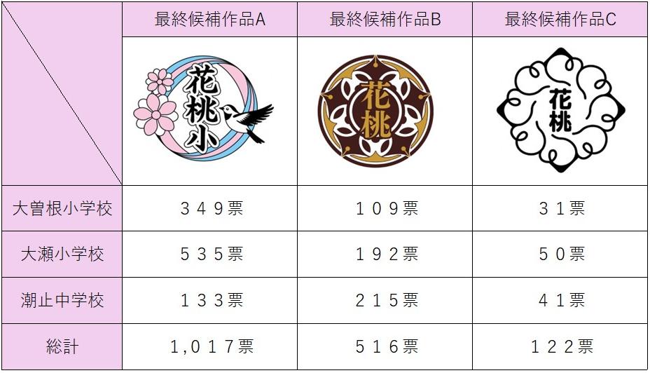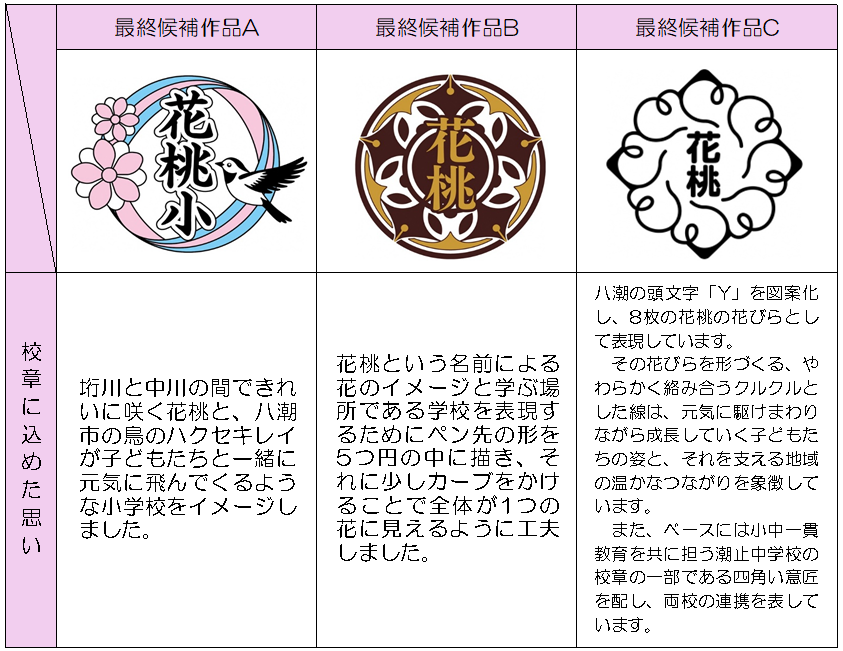 委員の回答結果から最終候補作品Aを花桃小学校の校章として選定することに決定しました。