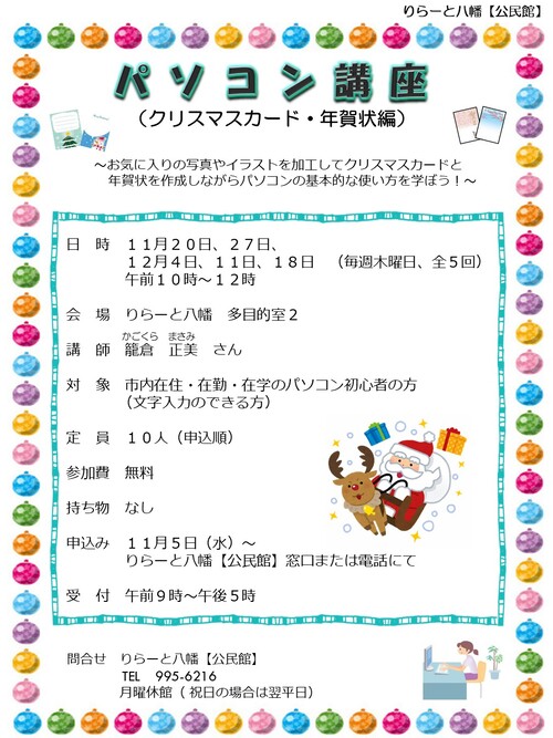 りらーと八幡【公民館】パソコン講座(クリスマスカード・年賀状編)