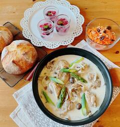 チキンフリカッセ(鶏肉のクリームソース煮込)、カンパーニュ(田舎風パン)、キャロットラペ(細切りニンジンのサラダ)、デザート(ベリーのゼリー)