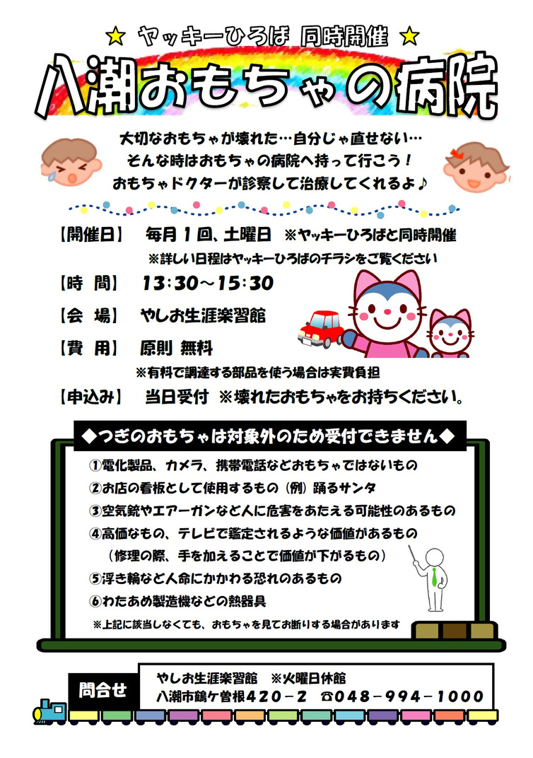 おもちゃドクターの詳細やお申込みについては、やしお生涯楽習館までお問い合わせください。
