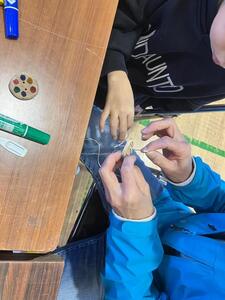 体育館では、ネイチャーゲームとして、木材を使った「ぶんぶんゴマ」やシュロの葉を使った「手裏剣」を作りました。