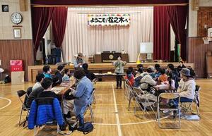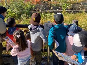 松之木公園内の植物などを観察し、葛西用水を眺めながら松之木小学校体育館へ移動しました。