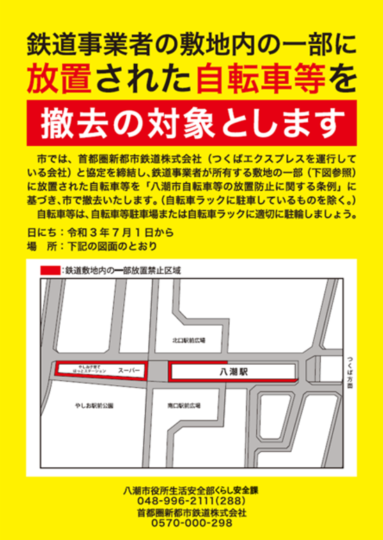 市では、首都圏新都市鉄道株式会社(つくばエクスプレスを運行している会社)と協定を締結し、令和3年7月1日から鉄道事業者が所有する敷地の一部(下図参照)に放置された自転車などを「八潮市自転車等の放置防止に関する条例」に基づき、撤去します。(自転車ラックに駐車しているものを除く。)