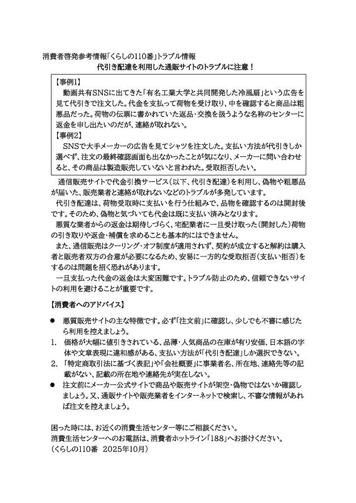 10月 代引き配達を利用した通販サイトのトラブルに注意!(PDF:1,013KB)