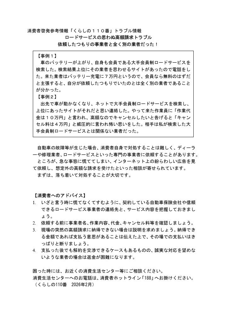 2月 ロードサービスの思わぬ高額請求トラブル 依頼したつもりの事業者と全く別の業者だった!(PDF:292KB)