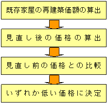 新増築以外の家屋は3年ごとの評価替えの年度に価格の見直しをします。価格の見直しは、3年間の建築物価の動向等を考慮して定められた補正率(再建築費評点補正率といい、令和6年度の評価替えでは固定資産評価基準により木造家屋1.11、非木造家屋1.07と示されました。)を適用して新たに再建築価額を求め、求めた再建築価額に新築時からの経過年数に応じた経年減点補正率を乗じて求めます。その後、見直し後の価格と見直し前の価格とを比較して、いずれか低い価格に決定します。