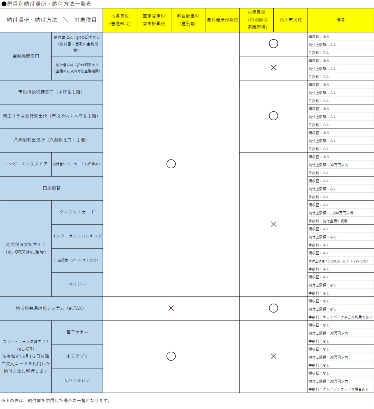 市税の納付方法一覧表