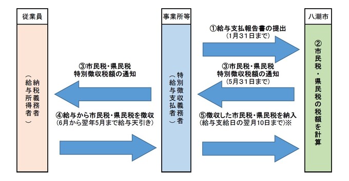 注記:従業員から徴収された市民税・県民税は、八潮市へ毎月納入していただくこととなりますが、従業員が常時10人未満の事業所は、八潮市へ申請することにより、年2回で納入することができる「納期の特例制度」をご利用いただけます。