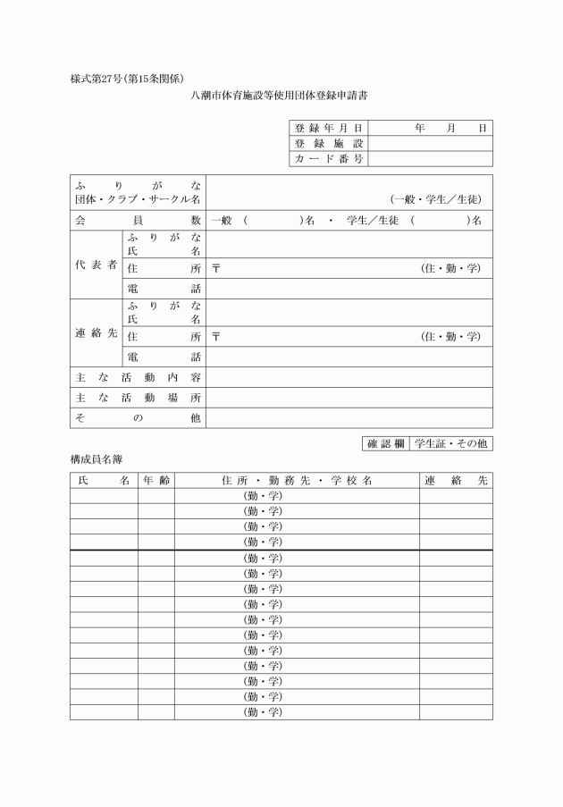 第15条 体育施設又は無料運動施設を使用しようとする者は、八潮市体育施設等使用団体登録申請書(様式第27号)を市長に提出し、団体の登録を受けなければならない。