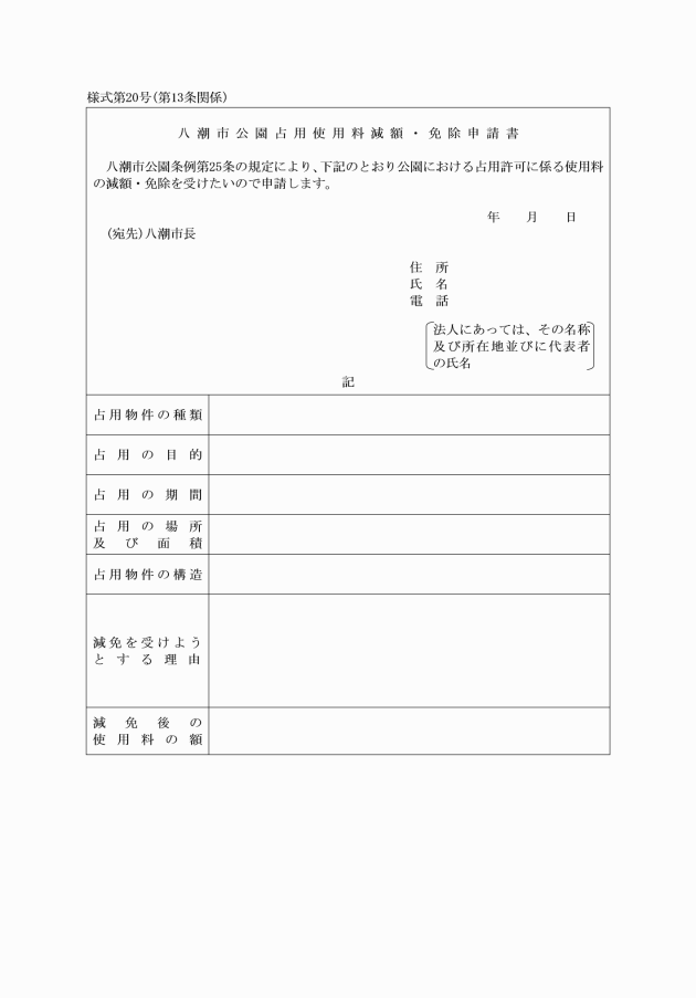(2) 占用許可を受ける者 八潮市公園占用使用料減額・免除申請書(様式第20号)