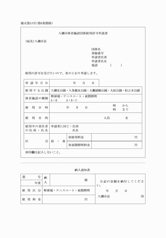 第3条 条例第11条第1項前段の申請書は、八潮市公園施設設置許可申請書(様式第1号)又は八潮市公園施設管理許可申請書(様式第2号)のとおりとする。