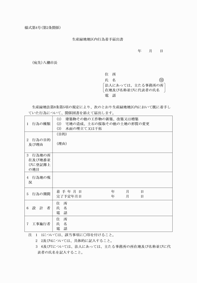 3 法第8条第5項の規定により届出をしようとする者は、様式第4号の生産緑地地区内行為着手届出書を市長に提出しなければならない。
