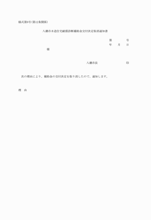 第12条 市長は、詐欺その他不正の行為により補助金の交付決定又は交付を受けた者があるときは、交付決定の全部若しくは一部を取り消し、又は既に交付した補助金の全部若しくは一部を返還させるときは、八潮市木造住宅耐震診断補助金交付決定取消通知書(様式第9号)によるものとする。