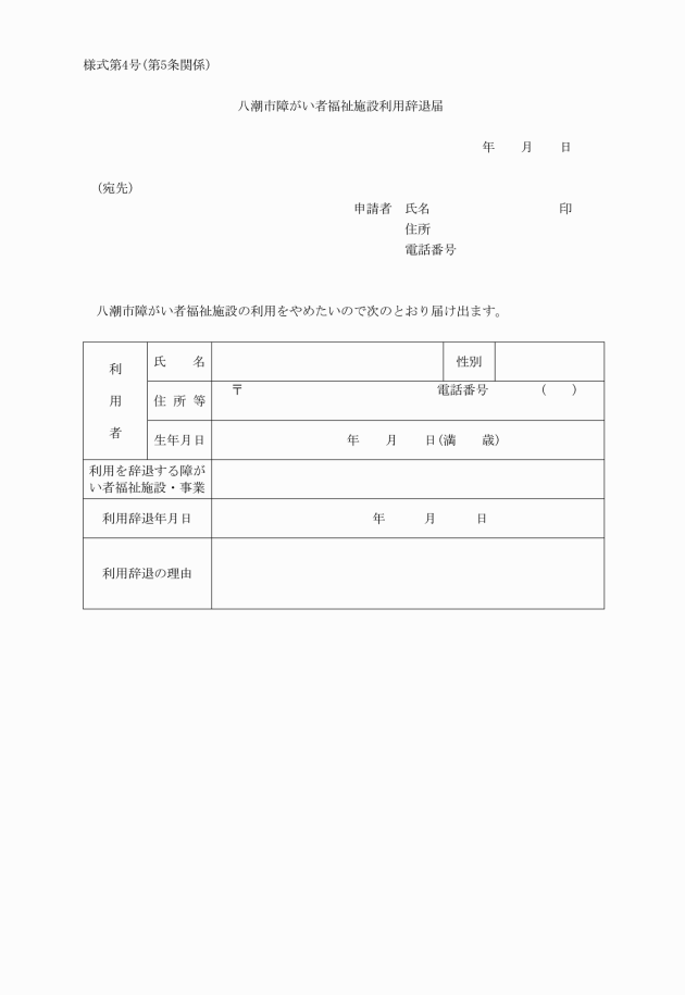 2 利用者は、障がい者福祉施設の利用をやめようとするときは、八潮市障がい者福祉施設利用辞退届(様式第4号)により市長に届け出なければならない。