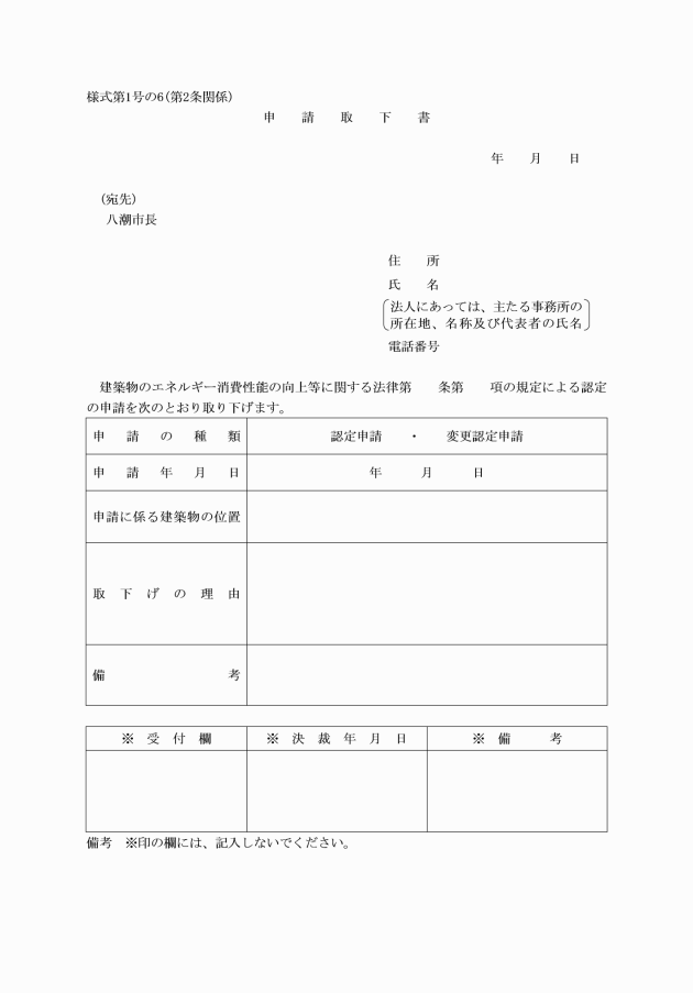 第2条 法第11条第1項の規定により提出した建築物エネルギー消費性能確保計画又は同条第2項の規定により提出した変更後の建築物エネルギー消費性能確保計画を取り下げようとする者は、計画取下書(様式第1号の5)を市長に提出しなければならない。