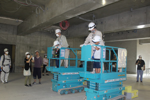 7月1日(土曜日)、新庁舎の工事現場見学会を開催しました。午前中は、小学生の親子を対象にした見学会とあわせて、現場で活躍している高所作業車の乗車体験や、実際に使われる内装材の裏面に「みらいのやしおに向けたメッセージ」と題して、すてきなメッセージやかわいらしいイラストを描いていただきました。皆さんに描いていただいた部材は、1階の待合中央の天井部分の仕上げ材として使われる予定です。