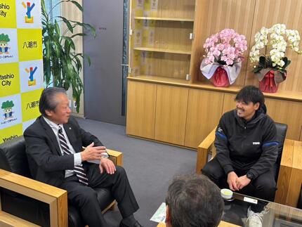 サッカー教室の前には、市長と対談を行い、市のスポーツ振興についての意見交換をしました。