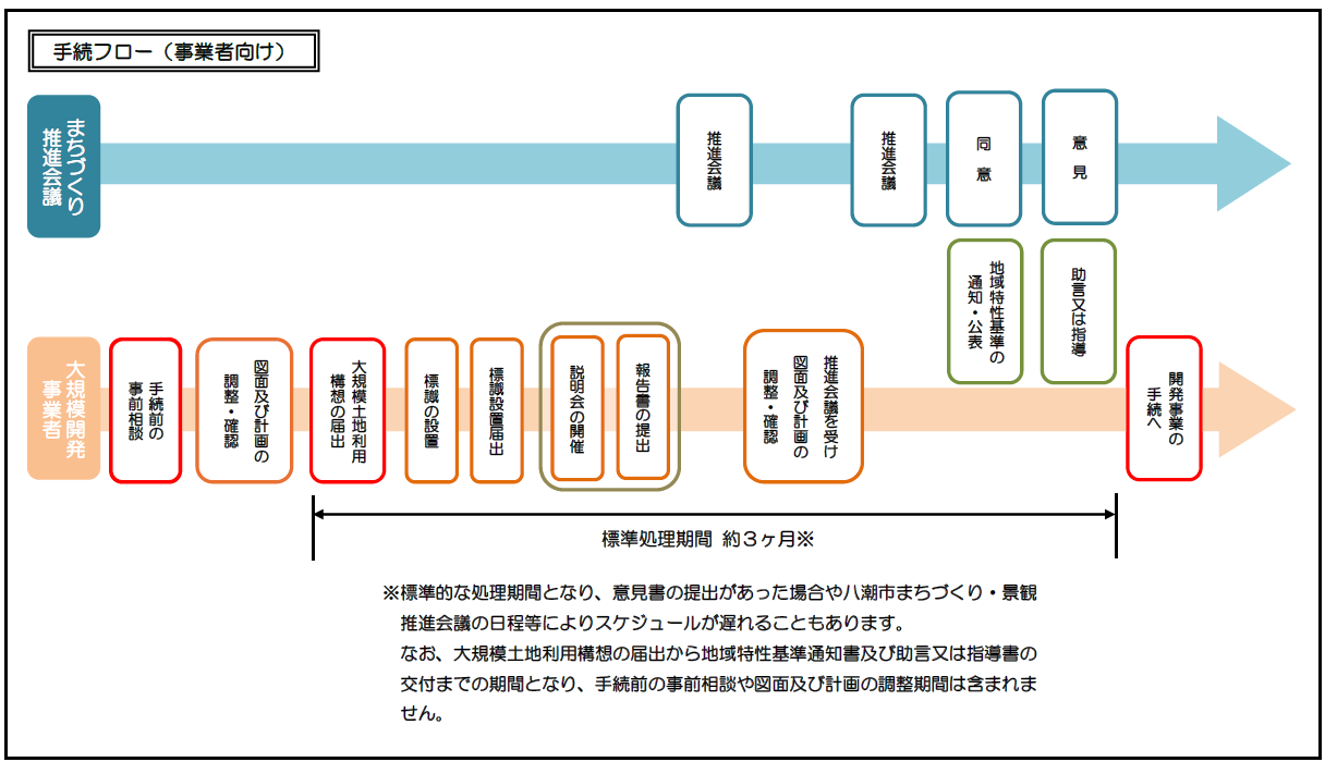八潮市みんなでつくる美しいまちづくり条例(以下、まちづくり条例とする。)に基づく大規模開発事業における手続の流れおよび地域特性基準についてご案内いたします。
