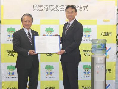 17日に本庁舎において「株式会社アクアクララおよび一般社団法人DEFLUSとの災害時応援協定締結式」を行いました。