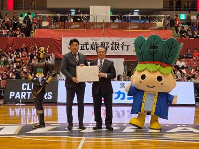 15日に越谷市立総合体育館にて「越谷アルファーズとの包括連携に関する+αタウン協定締結式」を行いました。