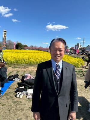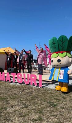 満開の花桃や菜の花をバックに、来場者に向けてあいさつを行いました。