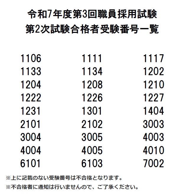 令和7年度第3回職員採用試験 第2次試験の合格者につきましては、次のとおりです。