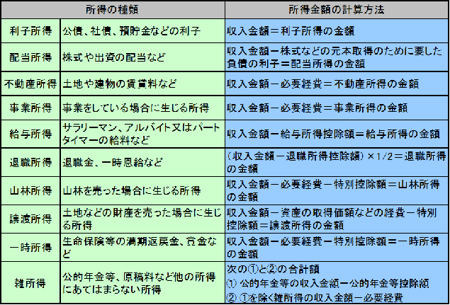 所得の種類と所得金額の計算方法